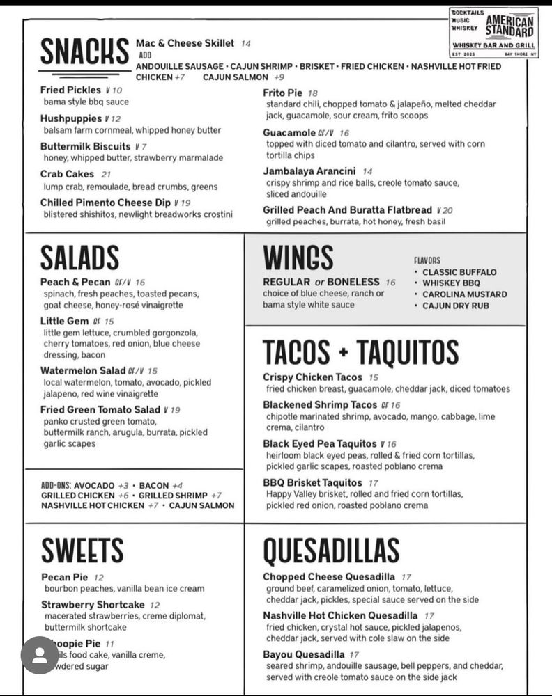 American Standard Whiskey Bar & Grill in Bay Shore, NY offers a menu filled with delicious New American cuisine. From flavorful salads like the Apple & Pecan Salad to indulgent dishes like the Cajun Surf & Turf Burger, this spot has something for everyone. Customers rave about the wings, burgers, and unique cocktails, like the peach margarita and blackberry whiskey smash. The friendly staff, cool vibe, and excellent service make this a must-visit location for food and drinks. The outdoor seating, live music, and happy hour specials create a lively atmosphere perfect for a night out. Whether you're a fan of traditional dishes or looking to try something new, American Standard Whiskey Bar & Grill provides a memorable dining experience.